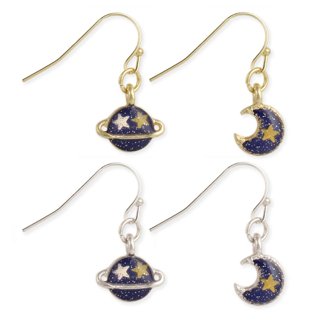 It's a tiny universe for your ears! Dainty and adorable tiny charm moon and planet earrings include glitter stars and are too much fun to wear! Mismatched pair just ups...