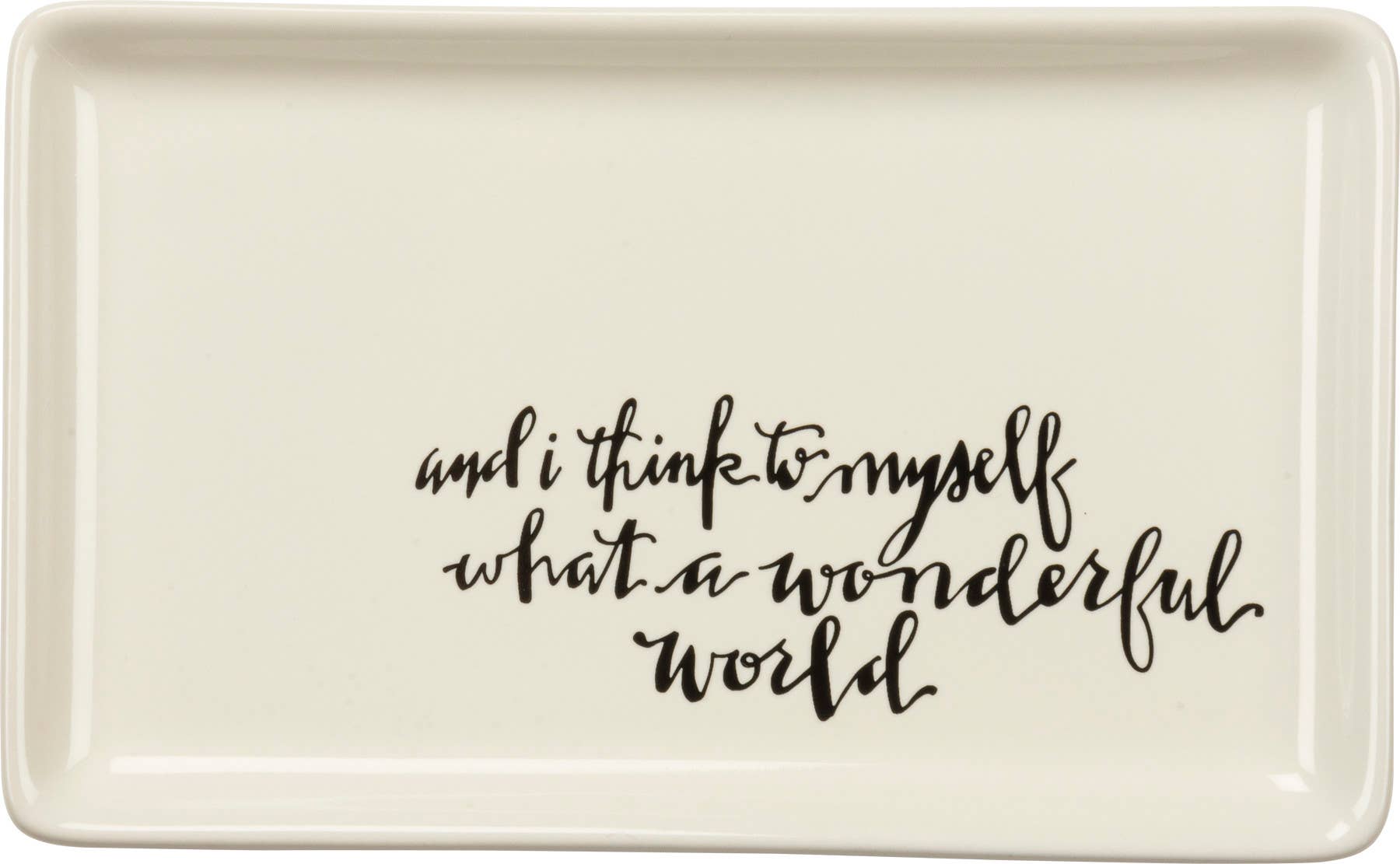 A black and white stoneware vanity tray featuring a hand lettered "And I Think To Myself What A Wonderful World" sentiment. Complements well with existing decor or coordinating design pieces.